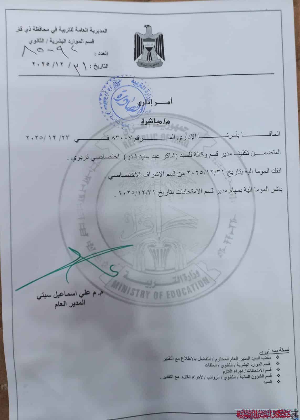 أصدرت مديرية تربية ذي قار أمرا إداريا يقضي بتكليف شاكر عبد عايد مديرا لقسم الامتحانات في المديرية.