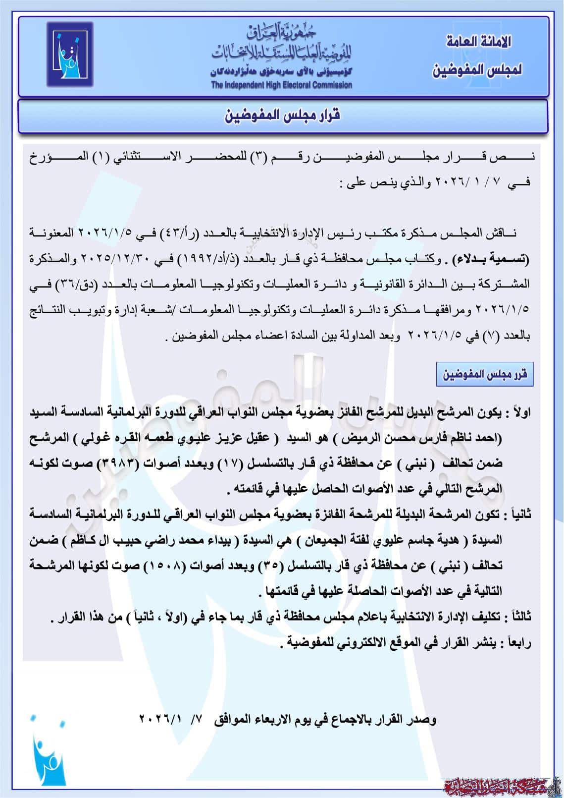 وبيّنت المفوضية أنها كلفت الإدارة الانتخابية باتخاذ الإجراءات اللازمة، وإشعار مجلس محافظة ذي قار بأسماء البدلاء.