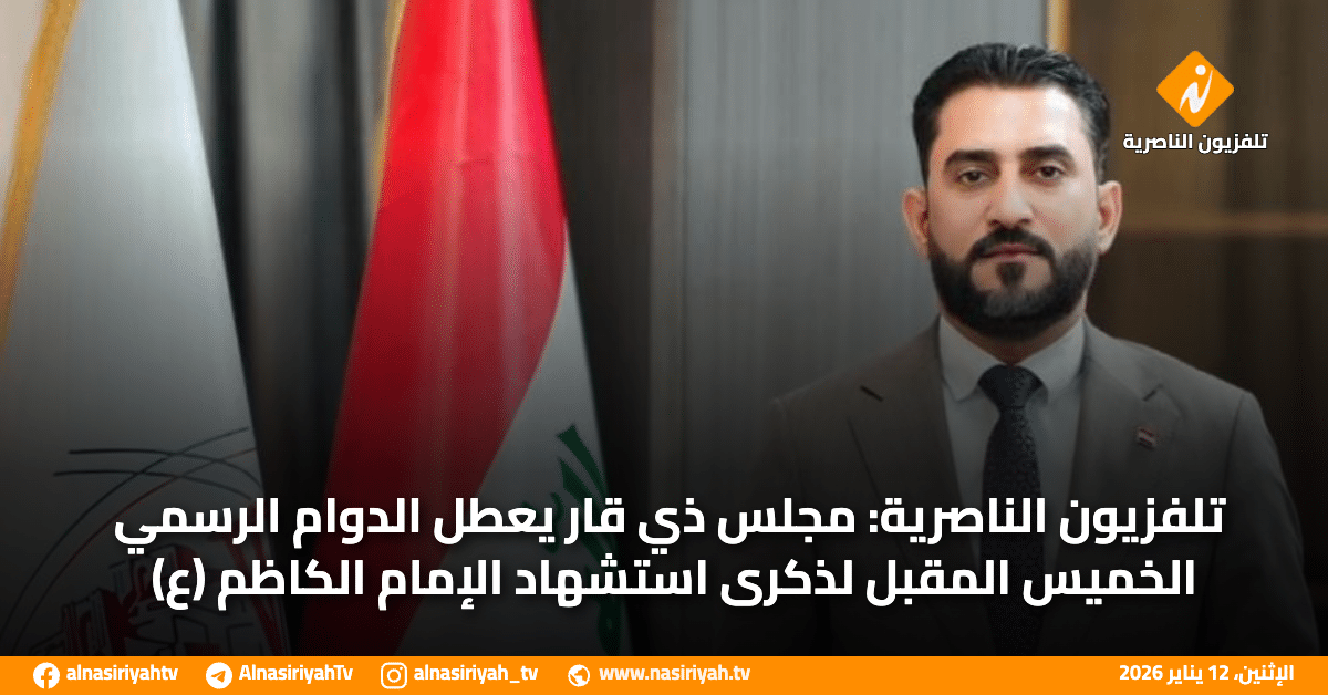 أعلن المتحدث باسم مجلس ذي قار الحقوقي احمد سليم عن تعطيل الدوام الرسمي يوم الخميس المقبل في المحافظة، وذلك إحياء لذكرى استشهاد الإمام موسى الكاظم عليه السلام.