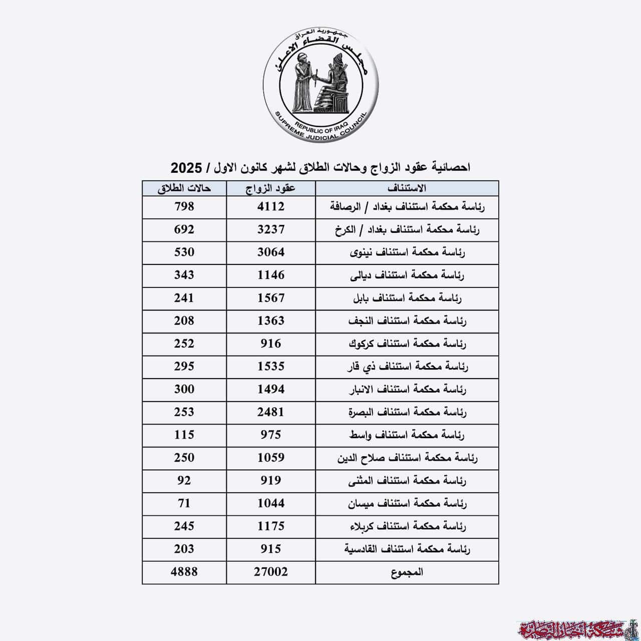 كشفت إحصائية صادرة عن مجلس القضاء الأعلى عن ارتفاع لافت في حالات الطلاق بمحافظة ذي قار خلال شهر كانون الاول الماضي.