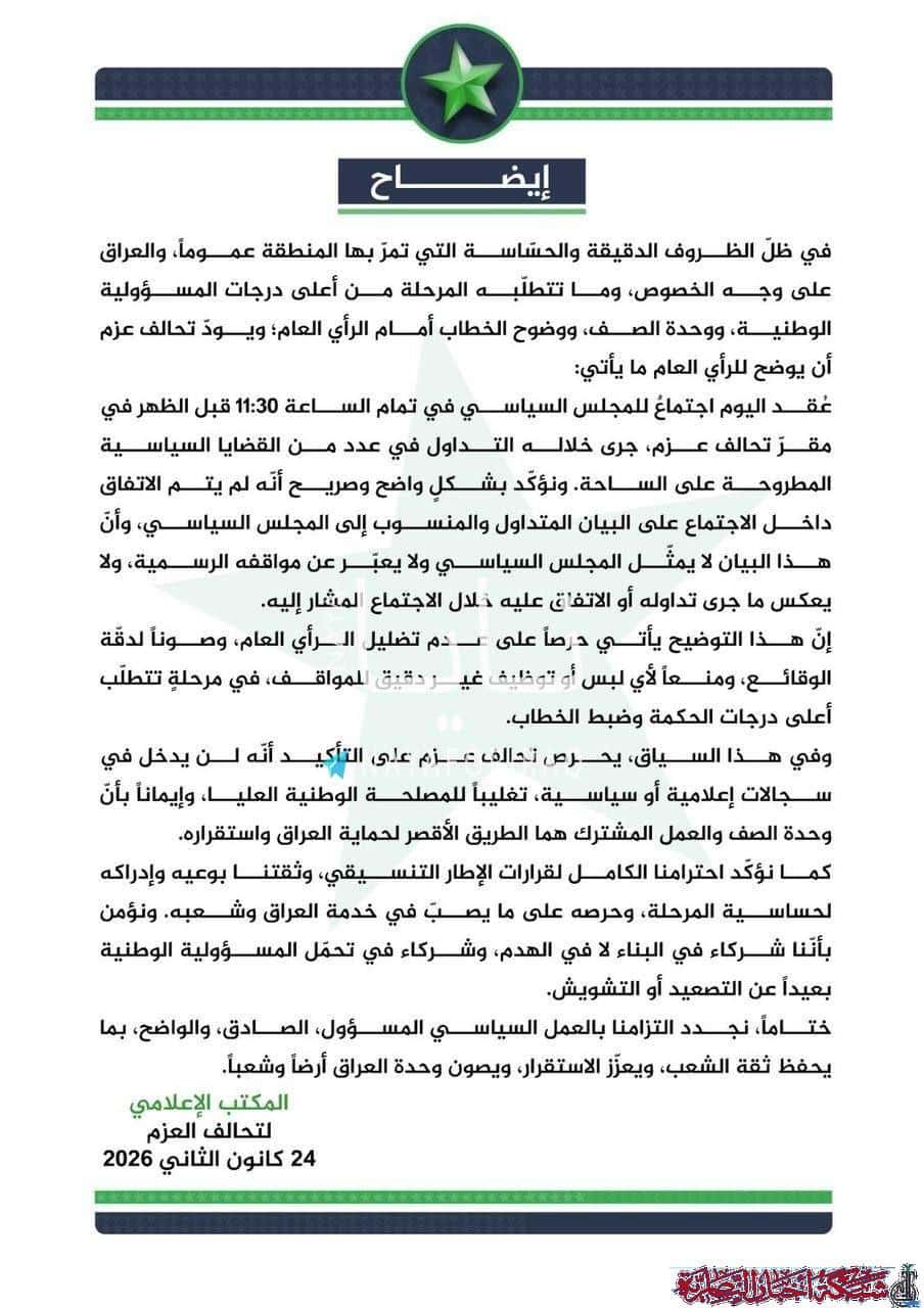 أوضح تحالف عزم بشأن البيان المنسوب إلى المجلس السياسي الوطني حول مرشح رئاسة الوزراء، مبينا أن قرارات المجلس تتخذ بالإجماع وليس بشكل فردي.