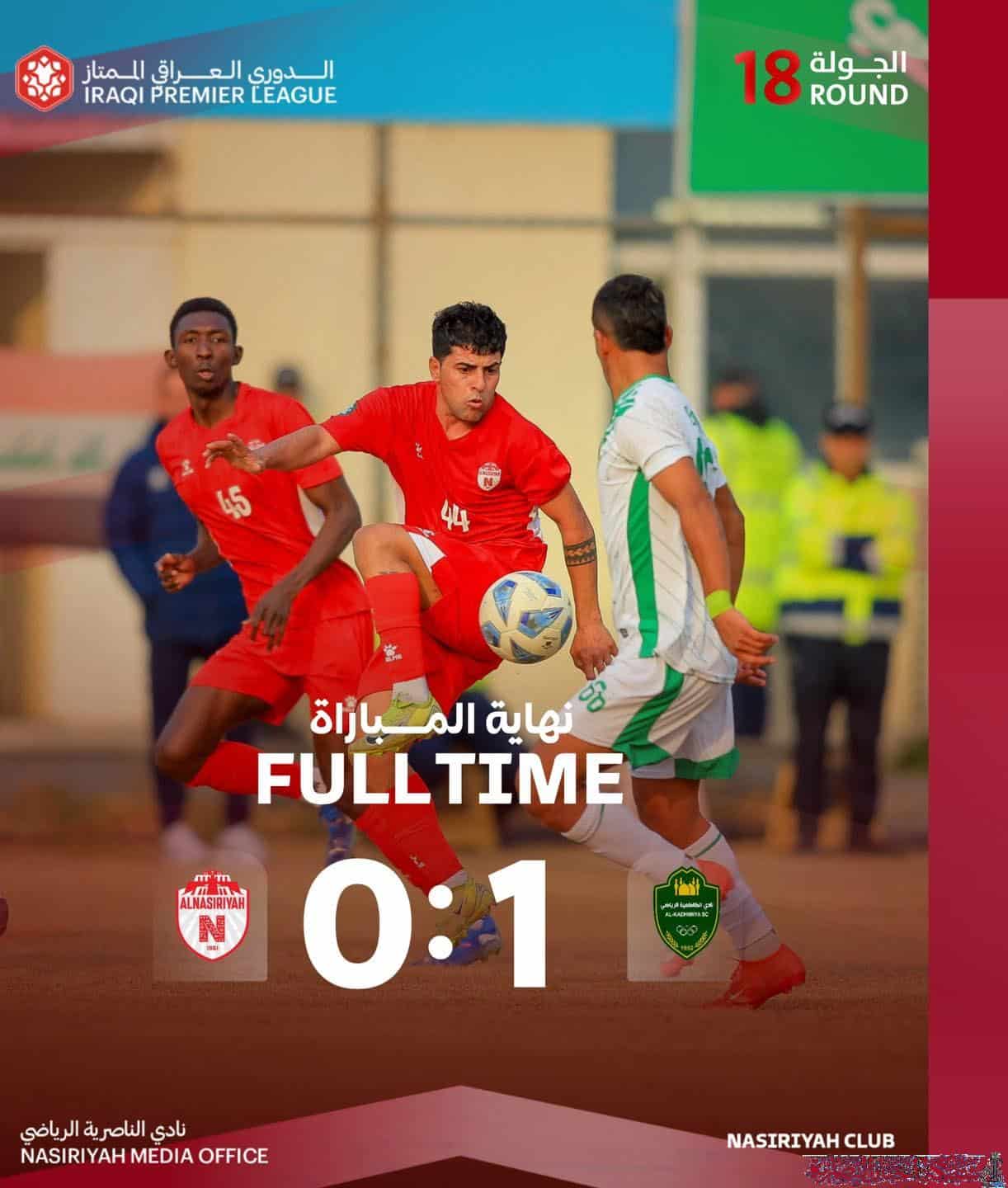 خسر نادي الناصرية أمام نظيره الكاظمية بهدف نظيف، في المباراة التي جمعتهما اليوم ضمن منافسات الجولة الثامنة عشرة من الدوري العراقي الممتاز لكرة القدم.