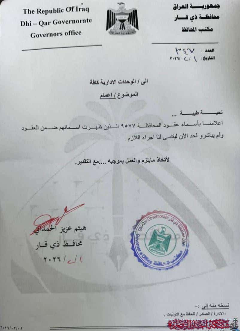 وجّه محافظ ذي قار هيثم الحمداني الوحدات الإدارية كافة بإعداد قوائم تفصيلية بأسماء المتعاقدين ضمن عقود المحافظة الموسومة بـ”9577” ممن لم يباشروا بوظائفهم حتى الآن.