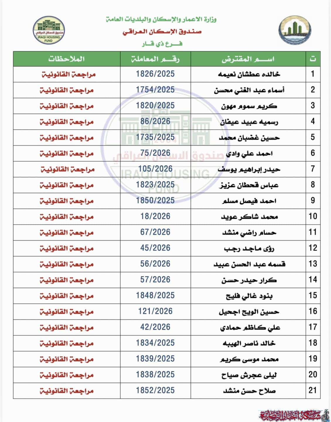 أعلن صندوق إسكان ذي قار دعوة عدد من المقترضين المدرجة أسماؤهم ضمن قائمة محددة لمراجعة الفرع لغرض استكمال الإجراءات القانونية الخاصة بعقود القروض.