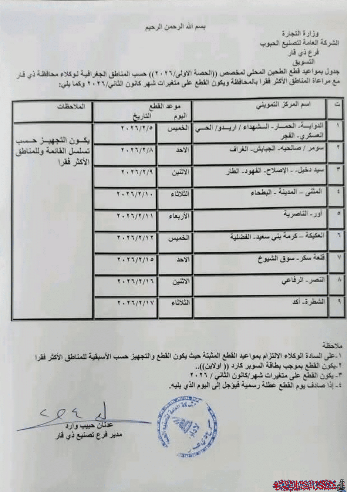 وأوضحت الوثيقة أن التوزيع يبدأ يوم الخميس ويستمر على مدى أيام متتالية ليشمل مناطق الدواية والحمّار والشهداء والإسكان والعسكري والفجر وسوق الشيوخ والنصر والشطرة وأور والناصرية إضافة إلى العكيكة وكرمة بني سعيد والفضلية وقلعة سكر.