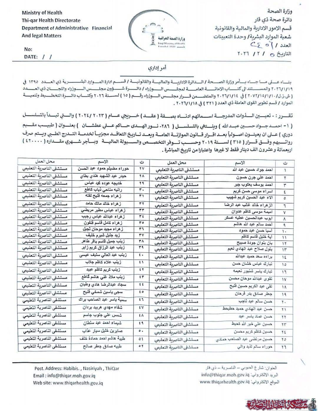 أعلنت دائرة صحة ذي قار صدور أمر إداري بتعيين أطباء من دفعة 2023–2024 بصفة عقود ضمن ملاك الدائرة.