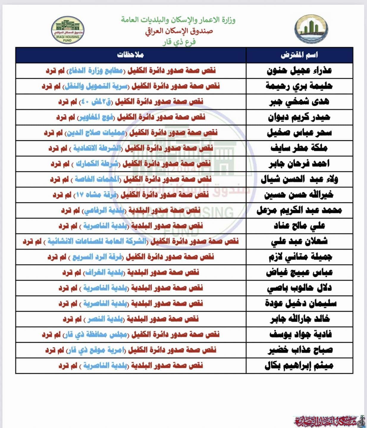 دعا صندوق الإسكان فرع ذي قار عددًا من المقترضين المدرجة أسماؤهم ادناه إلى مراجعة وحدة التدقيق، وذلك لوجود ملاحظات ونواقص في معاملات الإقراض الخاصة بهم.