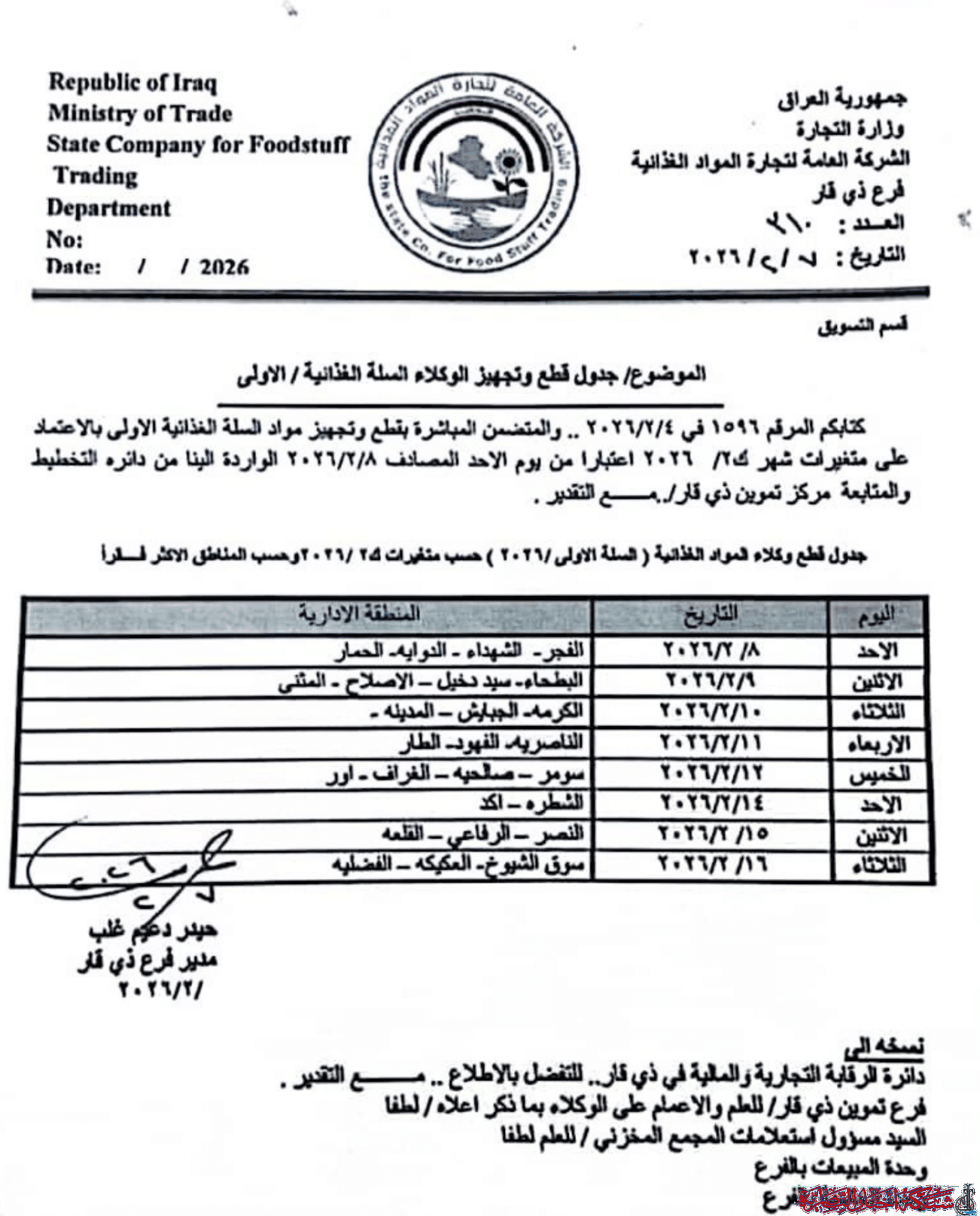 وفي وثيقة صادرة عن فرع الشركة العامة لتجارة المواد الغذائية في ذي قار، واطلعت عليه شبكة اخبار الناصرية تقرر الشروع بالتوزيع بدءًا من الأحد 2026/2/8، حيث ستُجهّز الوكالات التموينية بمفردات السلة وفق مواعيد محددة لكل منطقة.