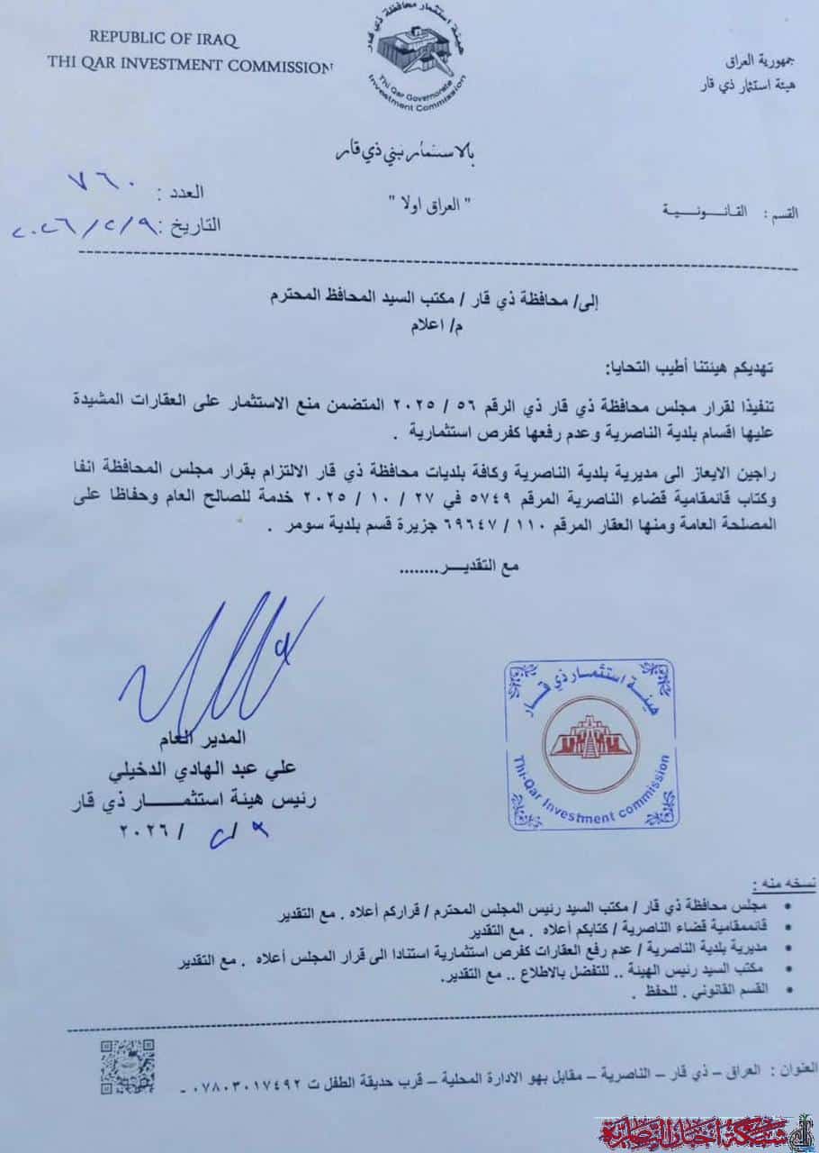 وأضاف البيان أن الهيئة قد أبلغت رسميا كلا من مكتب المحافظ، وقائممقامية قضاء الناصرية، ومديرية بلدية الناصرية بهذا القرار، بموجب الكتاب المرقم ٧٦٠ في ٢٠٢٦/٢/٩، حفاظا على المصلحة العامة والتزاما بالقانون.