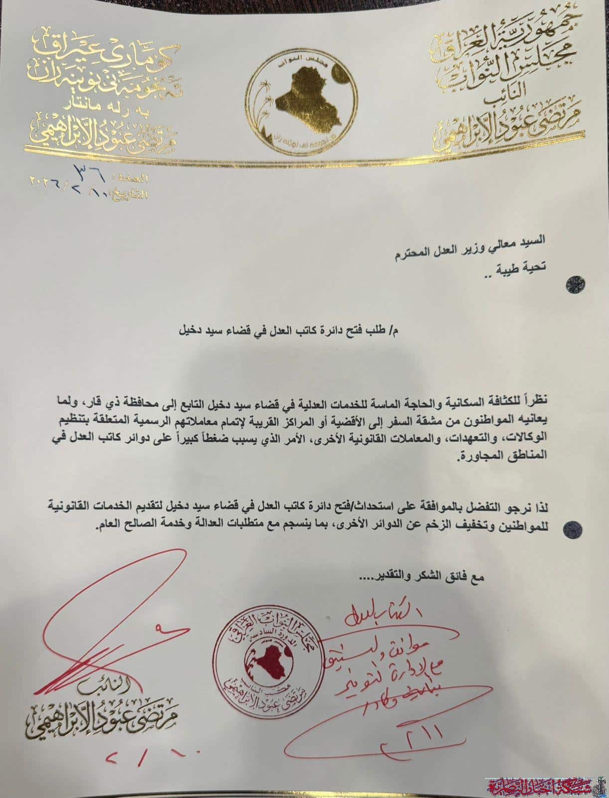 وافق وزير العدل على طلب النائب مرتضى الابراهيمي لفتح دائرة كاتب العدل في قضاء سيد دخيل بمحافظة ذي قار.
