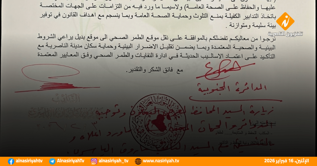 وأوضح الياسري في وثيقة اطلعت عليها شبكة اخبار الناصرية أن التوجيه يأتي في إطار متابعة ميدانية مباشرة للملف، والتنسيق مع الجهات المعنية لوضع حلول ومعالجات عملية تضمن نقل الموقع وفق الضوابط البيئية المعتمدة.