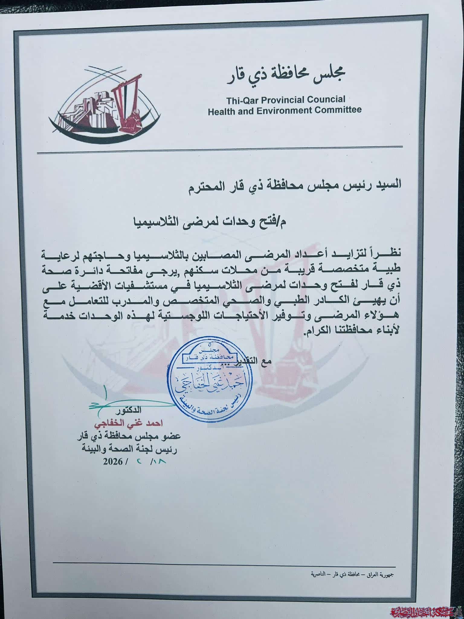 أعلن رئيس لجنة الصحة والبيئة في مجلس ذي قار، أحمد غني الخفاجي، عن تقديم طلب لرئاسة المجلس لفتح وحدات خاصة لمرضى الثلاسيميا في مستشفيات الأقضية.