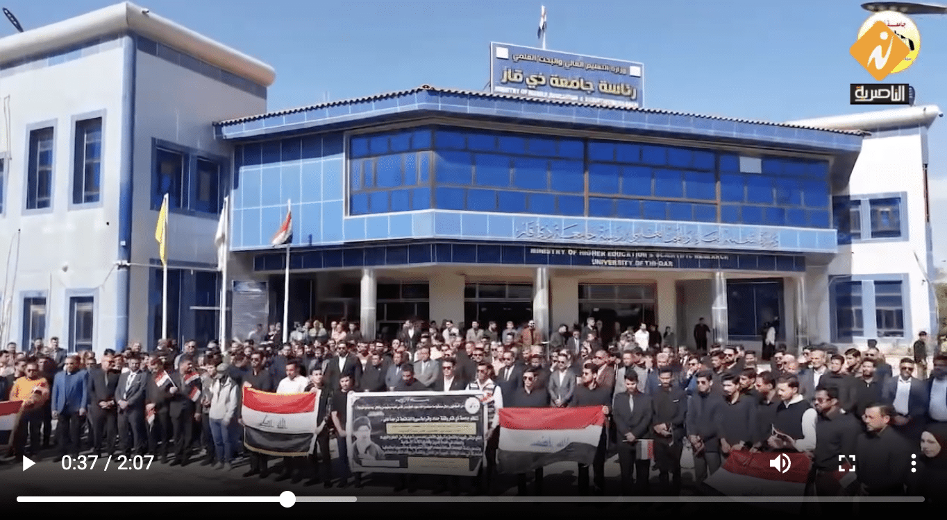 نظمت جامعة ذي قار مسيرة حاشدة تنديدا بما وصفته بالعدوان الأميركي الإسرائيلي على الجمهورية الإسلامية الإيرانية، بمشاركة عدد من التدريسيين والطلبة ومنتسبي الجامعة.