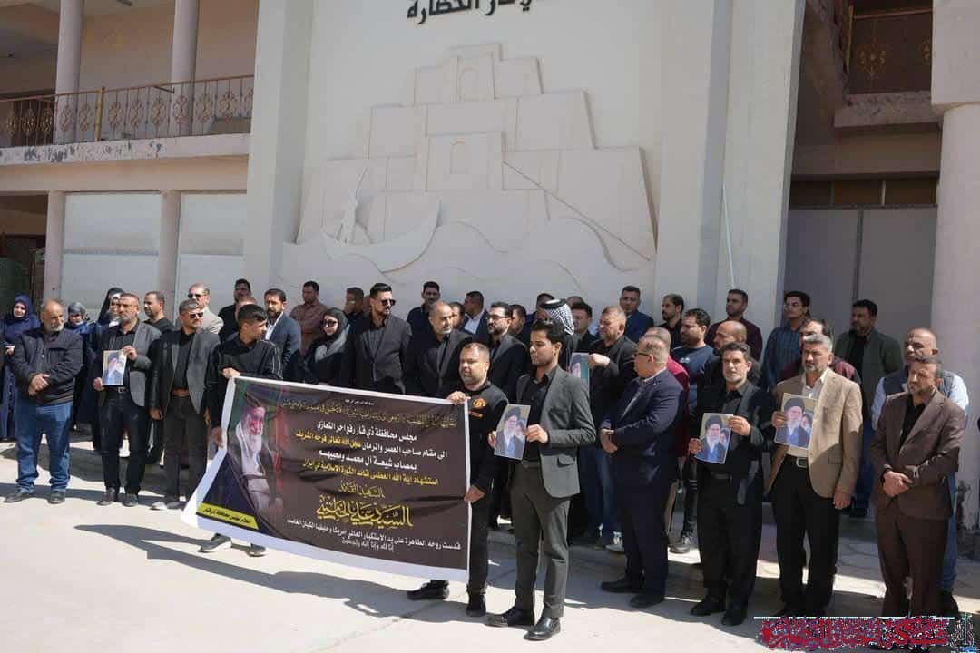 نظم مجلس محافظة ذي قار، اليوم، وقفة حداد بحضور رئيس وأعضاء وموظفي المجلس على روح آية الله العظمى الشهيد القائد السيد علي الخامنئي والشهيد أحمد الجابري.