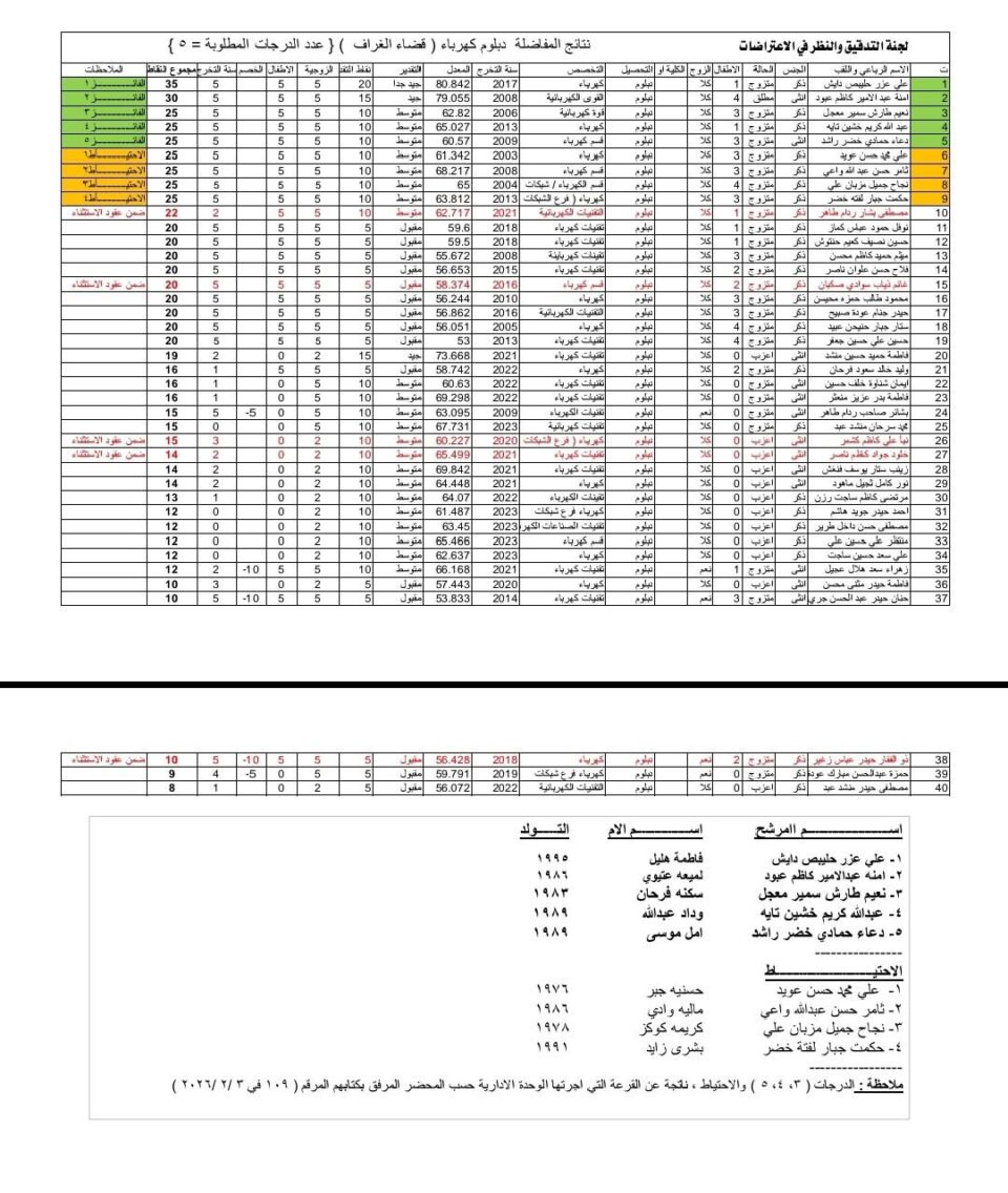 أعلنت قائممقامية قضاء الغراف أسماء الفائزين ضمن عقود المفاضلة الخاصة بـ 9577 درجة، بعد انتهاء أعمال الفرز والتدقيق من قبل اللجنة المختصة ووفقاً للضوابط والتعليمات المعتمدة.