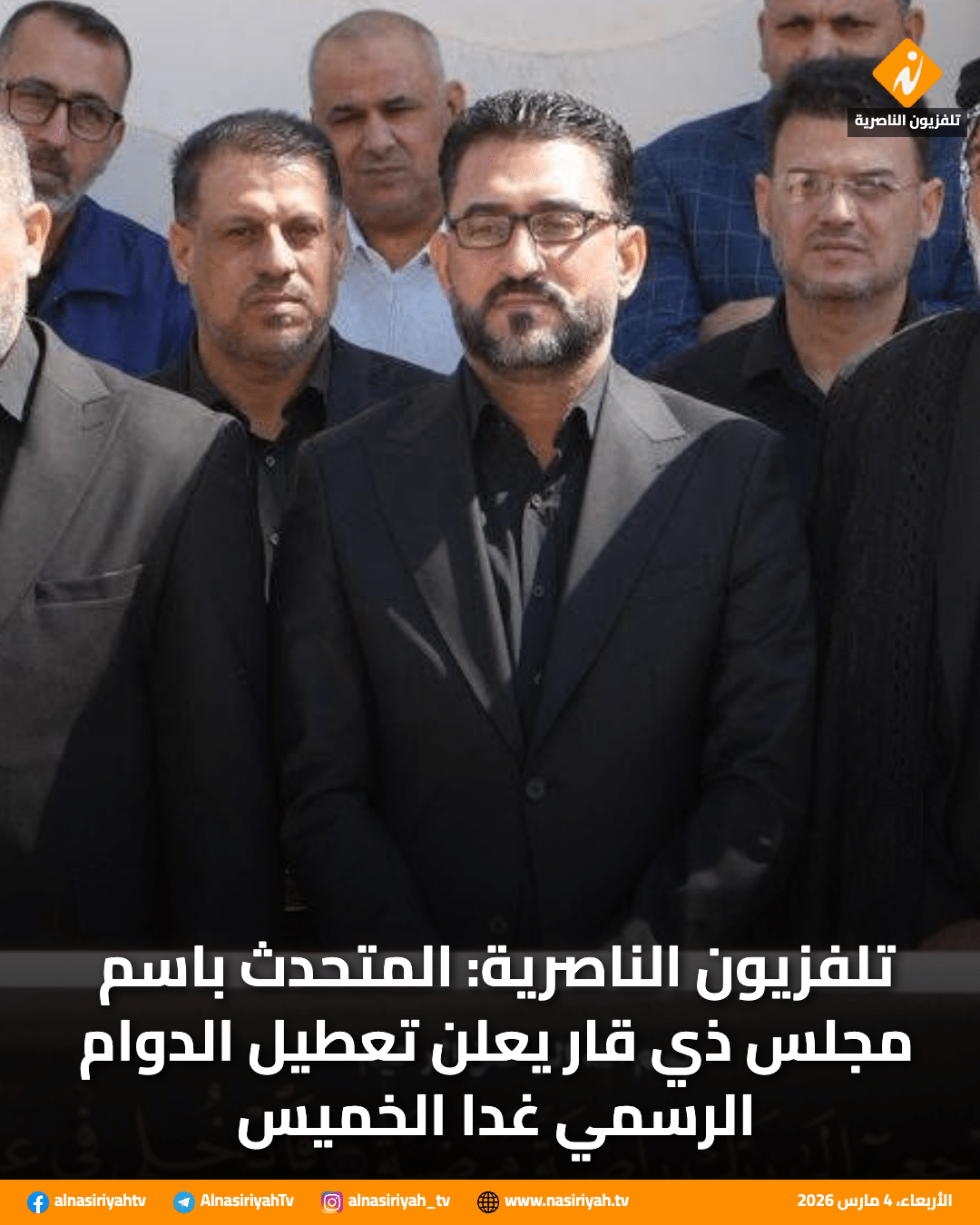 أعلن المتحدث باسم مجلس ذي قار الحقوقي أحمد سليم تعطيل الدوام الرسمي في المحافظة يوم غد الخميس.