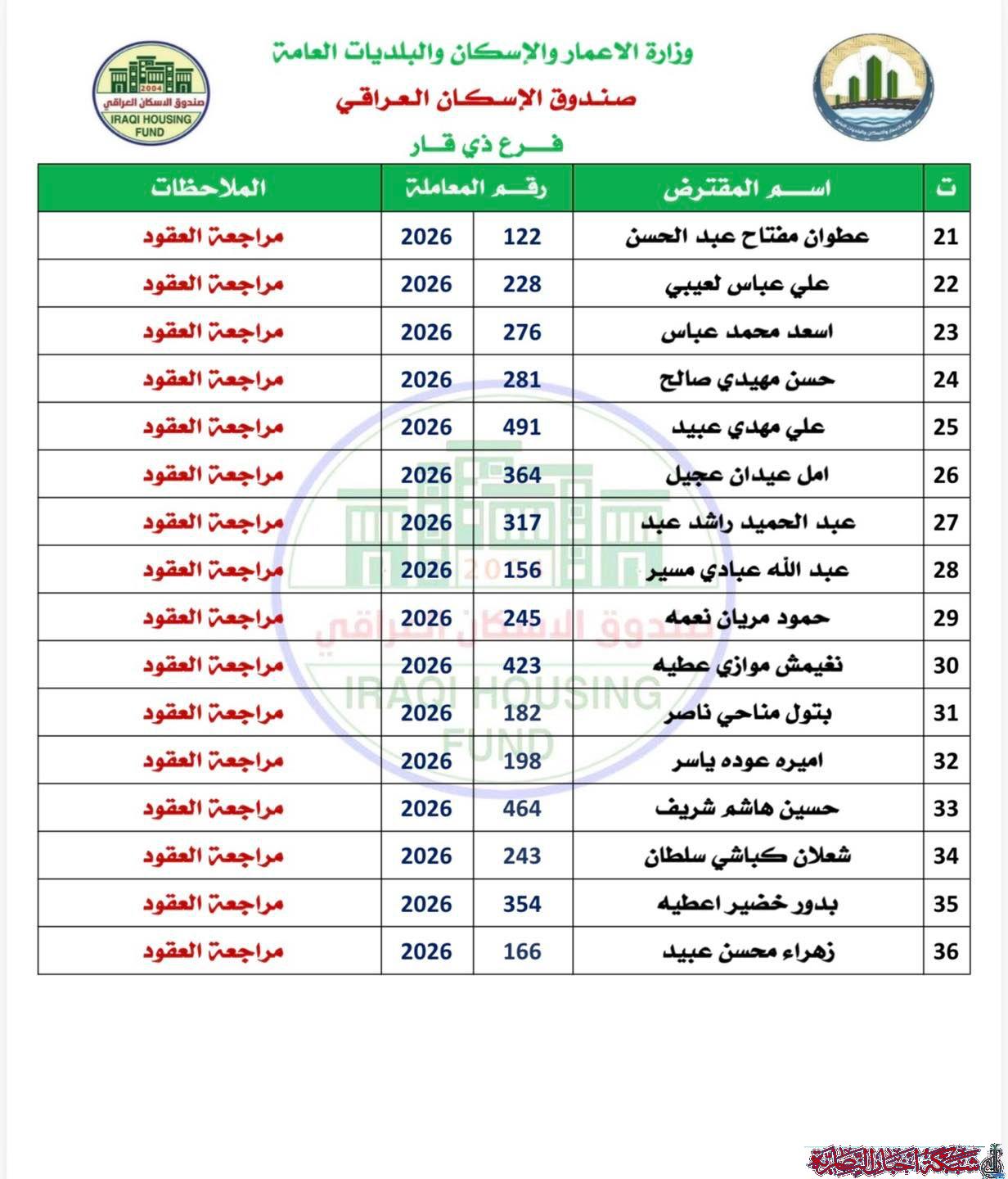 دعا صندوق الإسكان العراقي فرع ذي قار عددا من المقترضين المدرجة أسماؤهم ضمن القوائم إلى مراجعة وحدة القانونية والعقود في الفرع لإكمال إجراءات القرض.