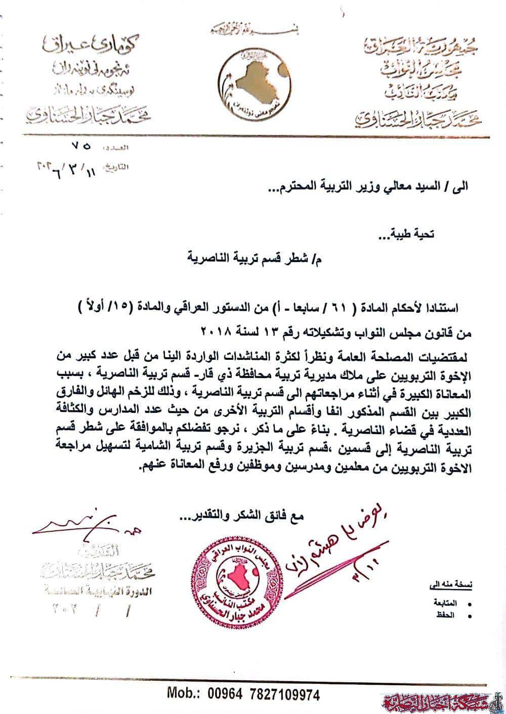 وذكر محمد جبار الحسناوي في وثيقة اطلعت عليها شبكة أخبار الناصرية أن هذا القرار يأتي لمقتضيات المصلحة العامة ونظرا لكثرة المناشدات الواردة من التربويين في المديرية.