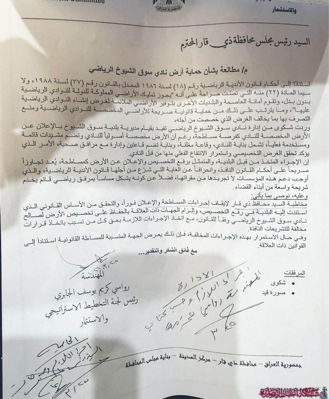 وفي بيان تابعته شبكة أخبار الناصرية، أوضحت أن إعادة الأرض للنادي يعكس التزام المجلس بدعم الأنشطة الرياضية وتوفير البنية التحتية المناسبة لها.