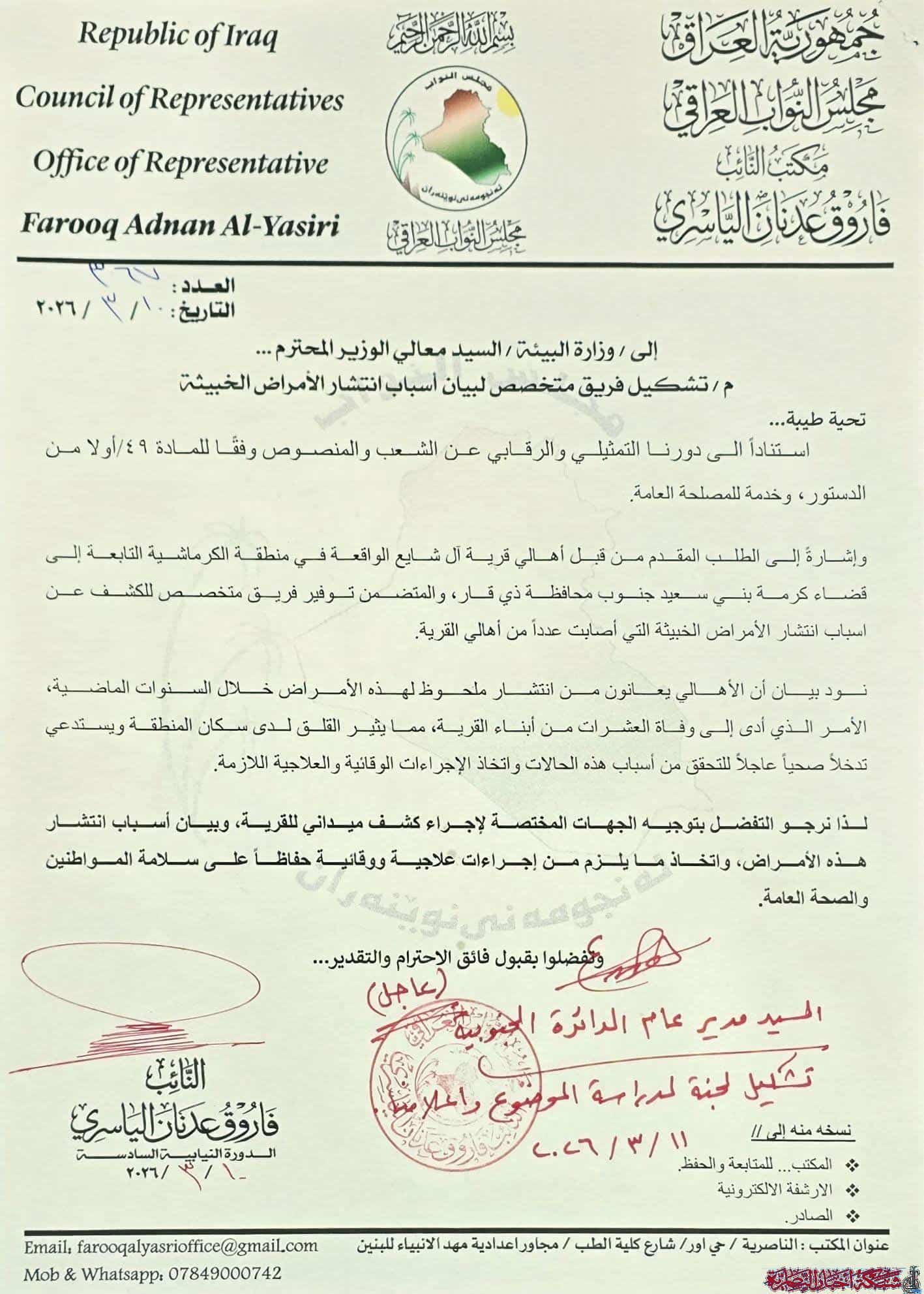 قال عضو مجلس النواب العراقي عن محافظة ذي قار إنه تم تشخيص ظهور حالات من الأمراض الخبيثة في إحدى قرى كرمة بني سعيد، مما يستدعي تدخلا صحيا عاجلا.