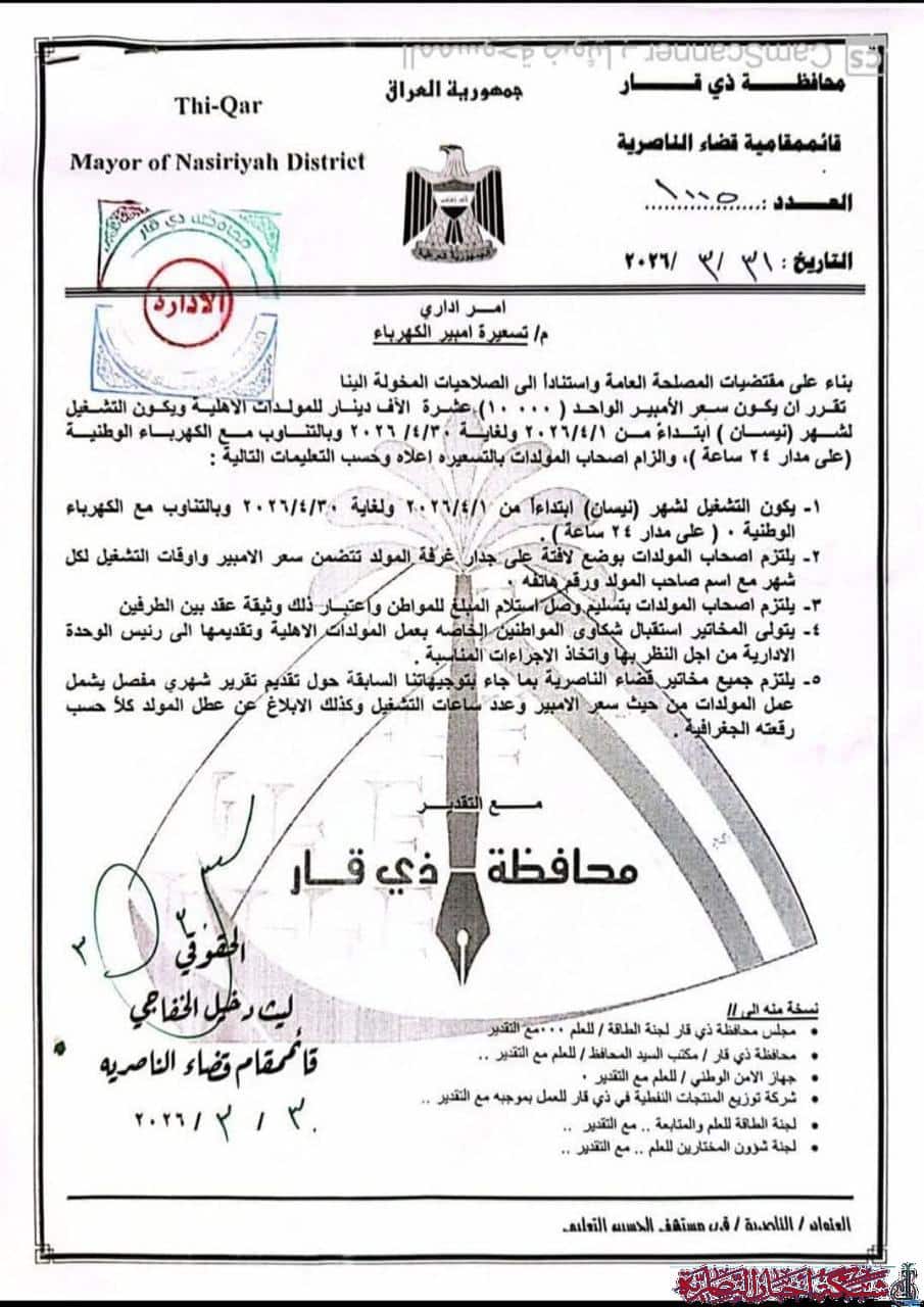 وذكرت القائممقامية، في وثيقة رسمية وردت إلى شبكة أخبار الناصرية، أن هذه الخطوة تأتي ضمن جهودها لتنظيم خدمة تجهيز الكهرباء وضمان العدالة في التسعيرة بين المواطنين.