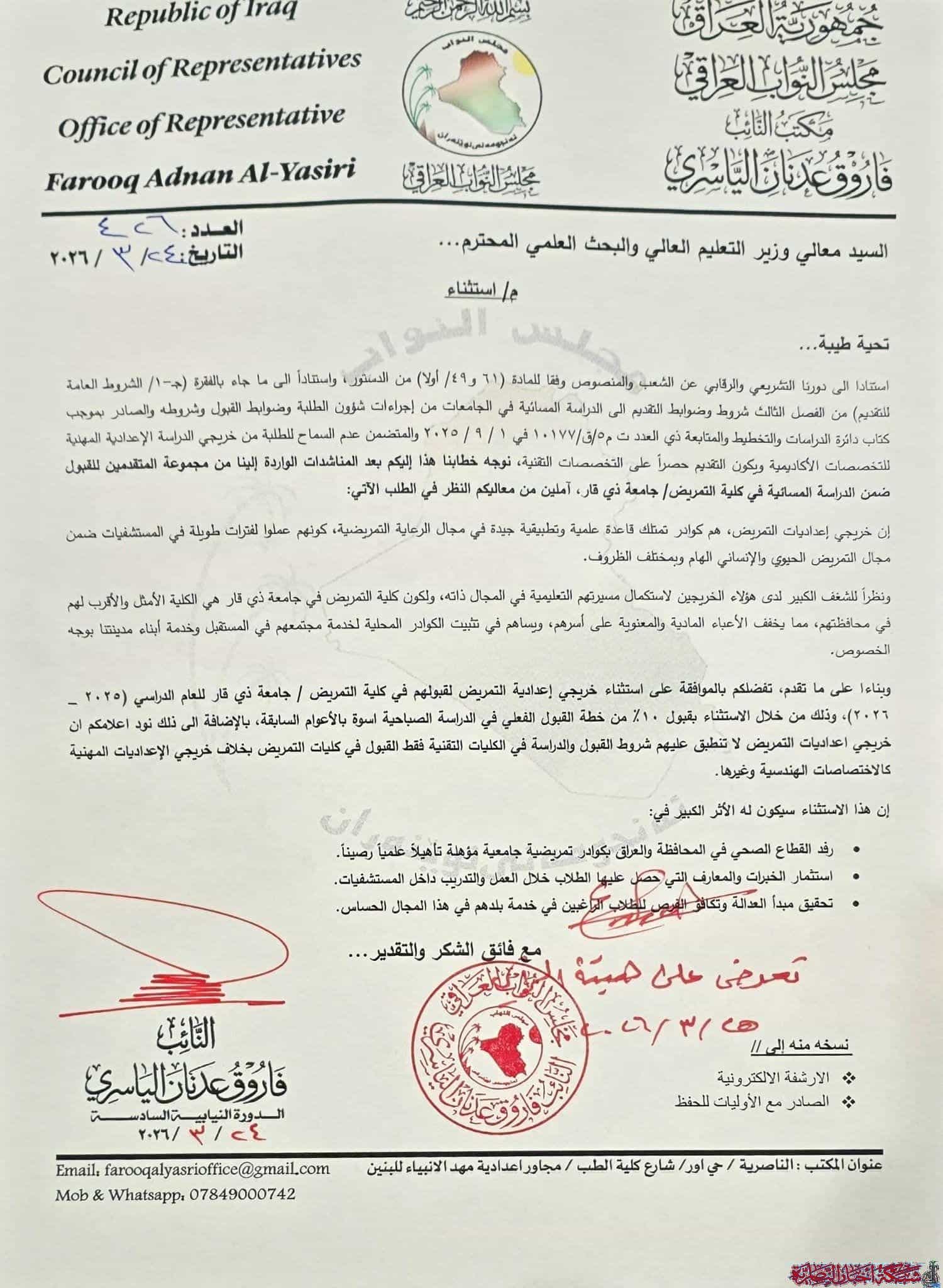 وأكد النائب أهمية الموافقة على هذا الاستثناء لقبول خريجي إعدادية التمريض في كلية التمريض بجامعة ذي قار للعام الدراسي 2025 – 2026 أسوة بالأعوام السابقة التي شهدت تطبيق هذا الإجراء.