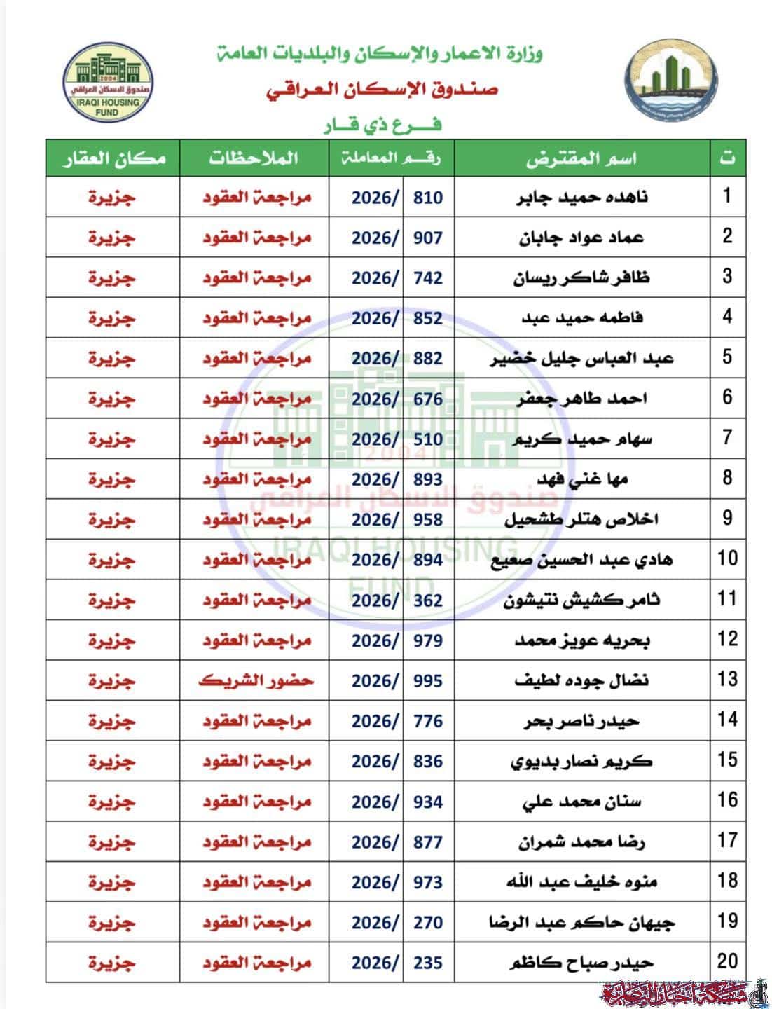 وأوضح الصندوق في بيان اطلعت عليه شبكة أخبار الناصرية أن المقترضين مطالبون بالحضور يوم الاثنين السادس من نيسان 2026 قبل الساعة الحادية عشرة صباحا لإتمام إجراءات توقيع العقد وحجز العقار وبصمة الكفيل.