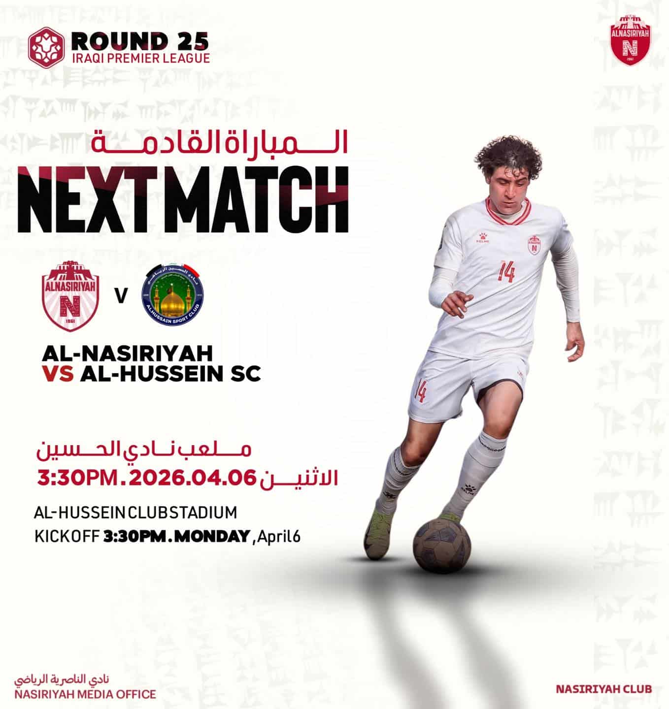 وأعلن الحساب الرسمي لنادي الناصرية عبر منصة فيسبوك في منشور تابعته شبكة أخبار الناصرية أن الفريق سيحل ضيفا على نادي الحسين في إطار استكمال مباريات الجولة المؤجلة من المسابقة.