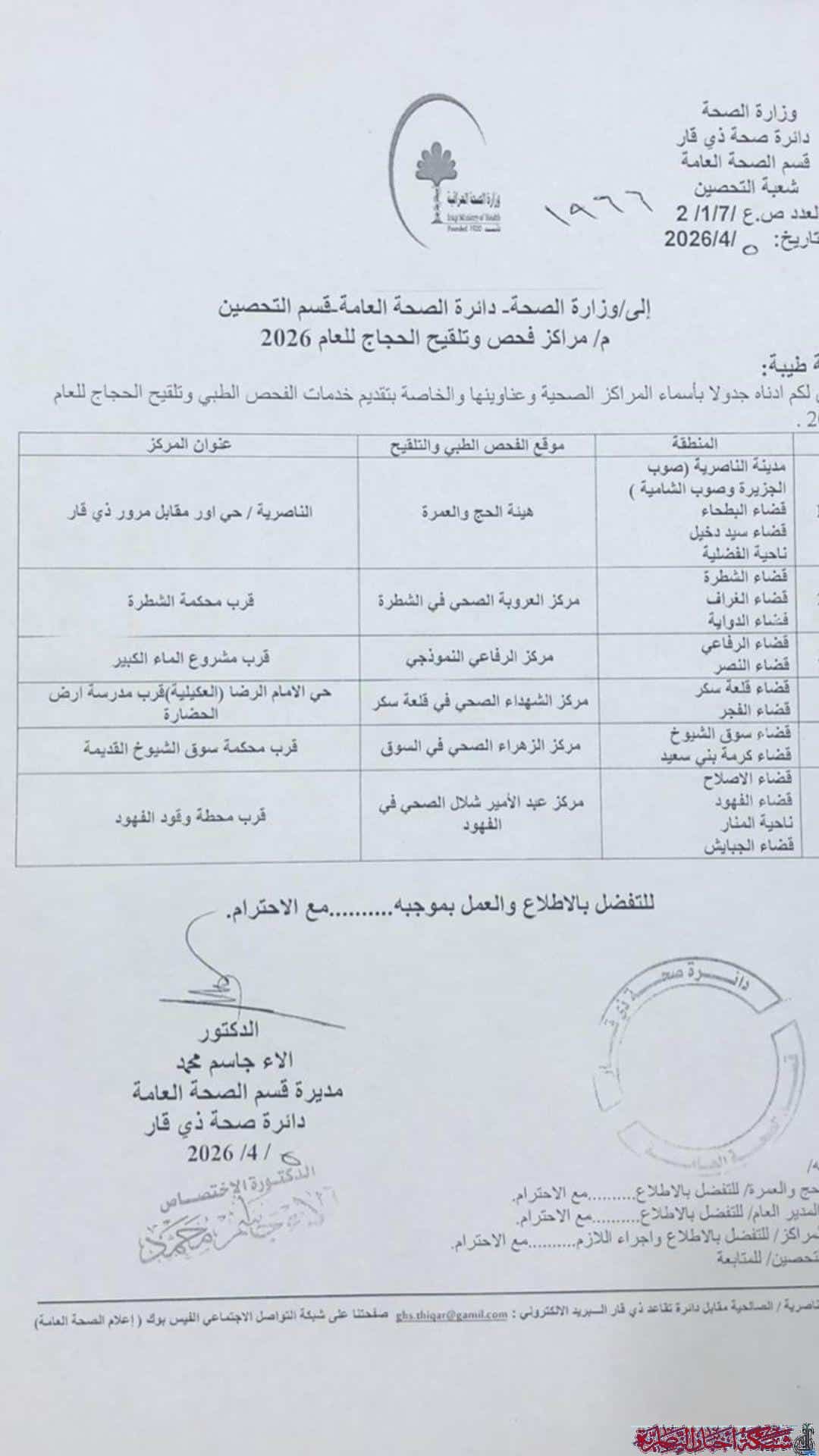 أعلنت دائرة صحة ذي قار عن افتتاح مراكز الفحص الطبي وتلقيح الحجاج للعام 2026 في عدد من المراكز الصحية المنتشرة في المحافظة.