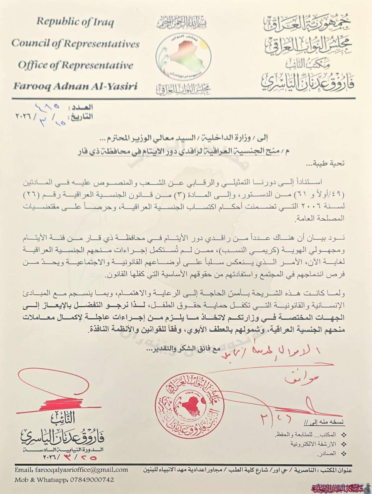 وأوضحت الوثيقة التي اطلعت عليها شبكة أخبار الناصرية أن الياسري وجه كتابا رسميا إلى وزير الداخلية يطالب فيه باستكمال إجراءات منح الجنسية للأيتام ومجهولي الهوية الراقدين في دور الأيتام بالمحافظة.