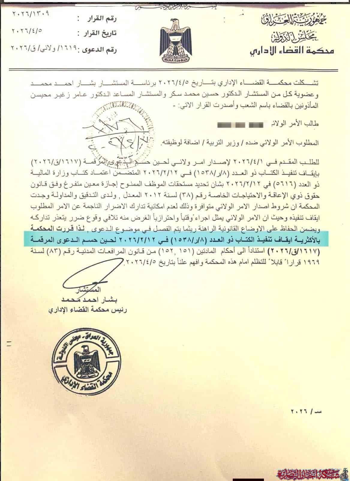 أعلن عضو مجلس النواب العراقي عن محافظة ذي قار فاروق الياسري صدور أمر ولائي من القضاء يقضي بإيقاف تنفيذ قرار وزارة التربية الخاص بحجب مخصصات المعين المتفرغ.