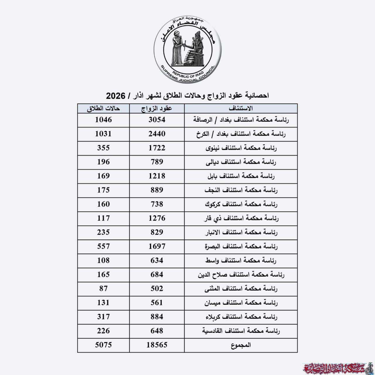 أعلن مجلس القضاء الأعلى العراقي عن إحصائية شهر آذار لحالات الطلاق والزواج في عموم المحافظات كاشفا عن انخفاض ملحوظ في معدلات الطلاق بمحافظة ذي قار.