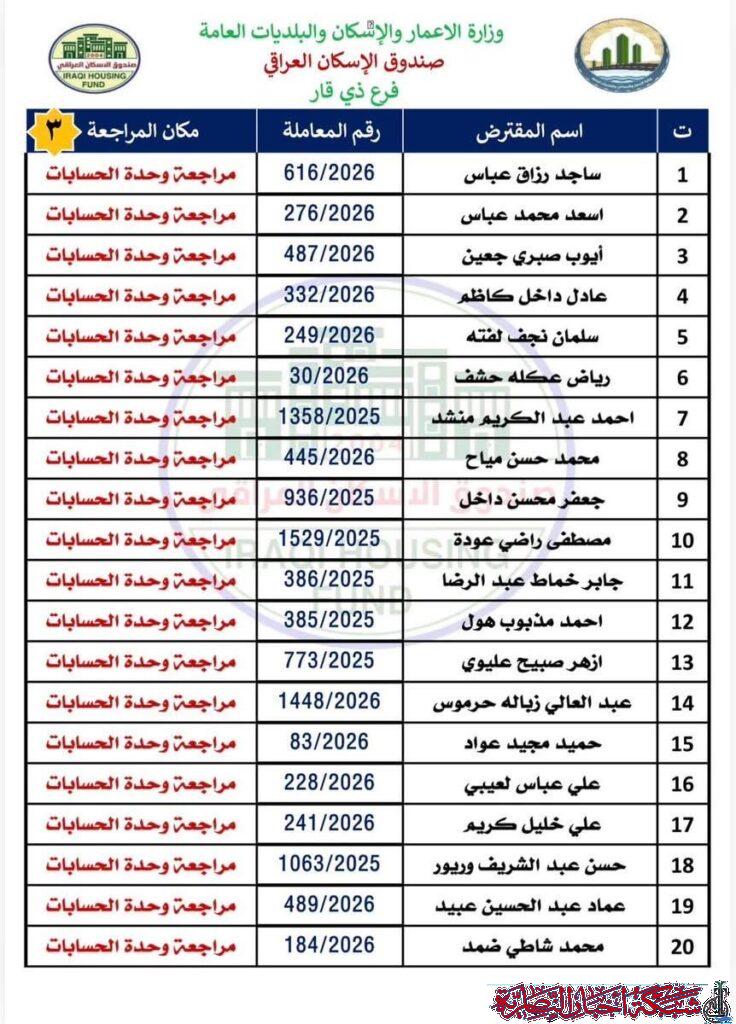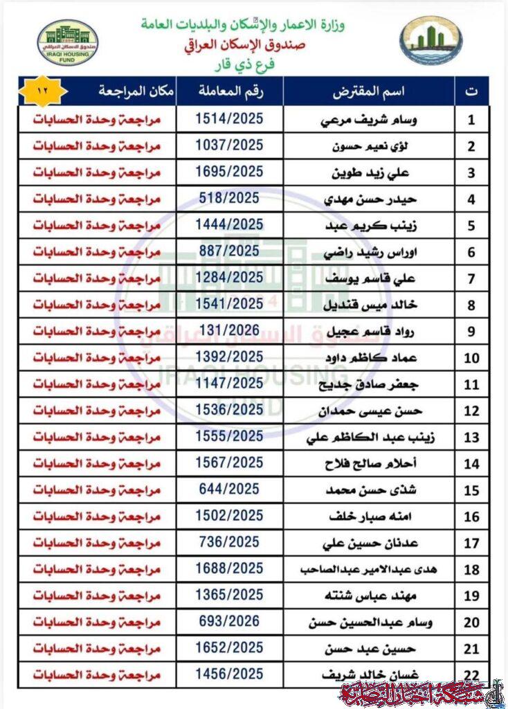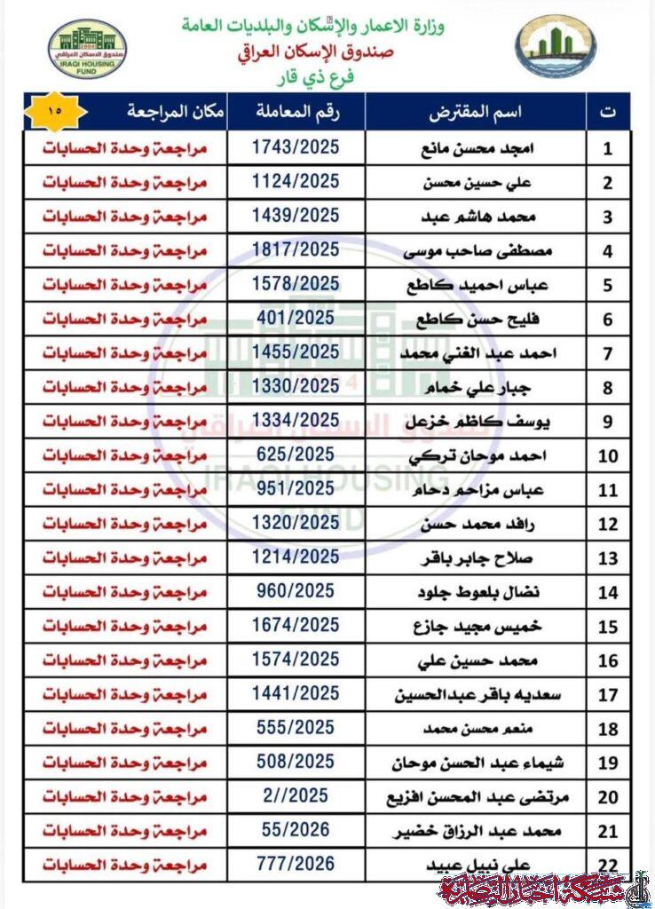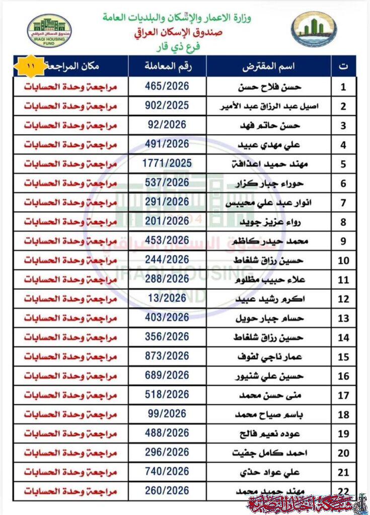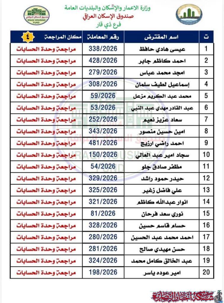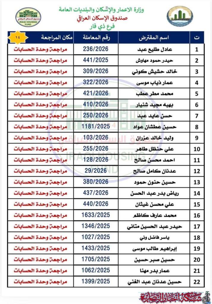 وأوضح مصدر في الصندوق في تصريح لشبكة أخبار الناصرية، أن على المقترضين مراجعة فرع ذي قار في وحدة الحسابات لاستلام الصكوك الواردة مؤكدا ضرورة حضور المقترض شخصيا مع إحضار البطاقة الوطنية الأصلية وبطاقة السكن الأصلية.
