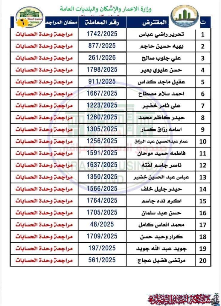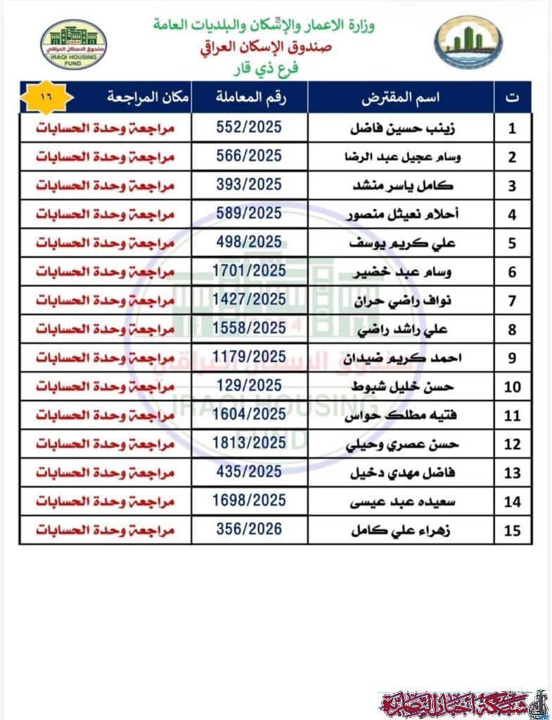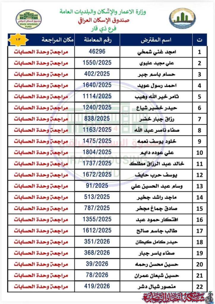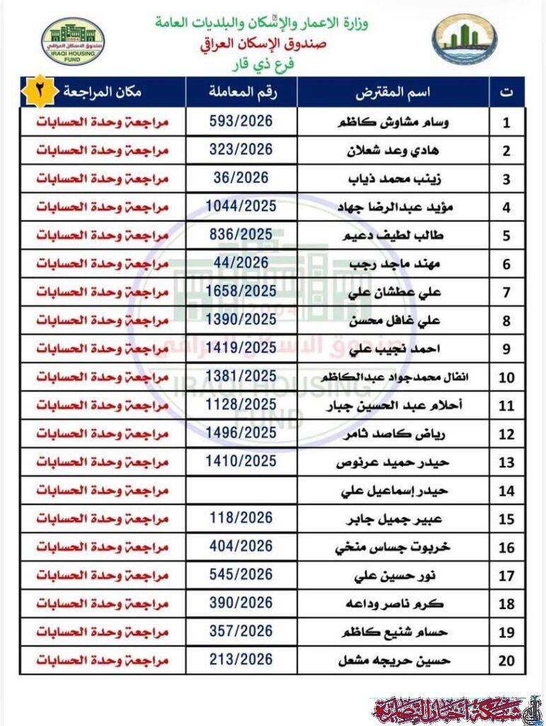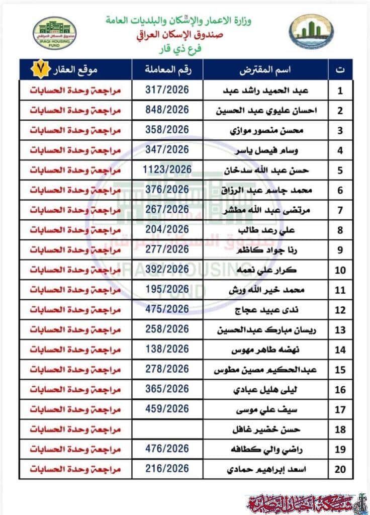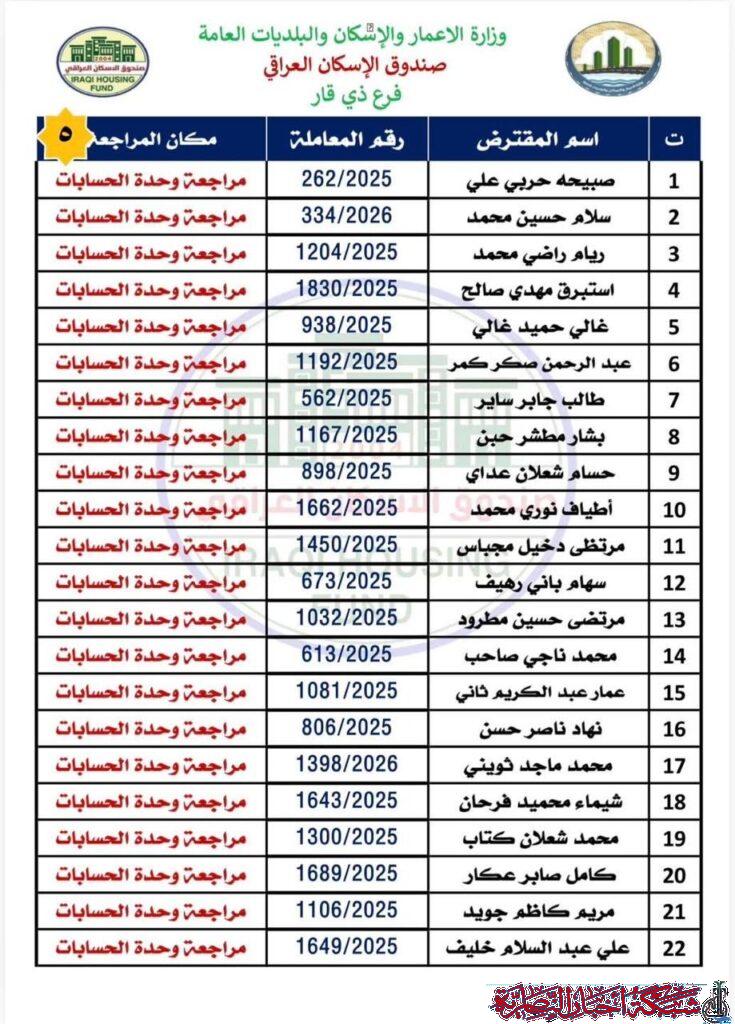وأوضح مصدر في الصندوق في تصريح لشبكة أخبار الناصرية، أن على المقترضين مراجعة فرع ذي قار في وحدة الحسابات لاستلام الصكوك الواردة مؤكدا ضرورة حضور المقترض شخصيا مع إحضار البطاقة الوطنية الأصلية وبطاقة السكن الأصلية.