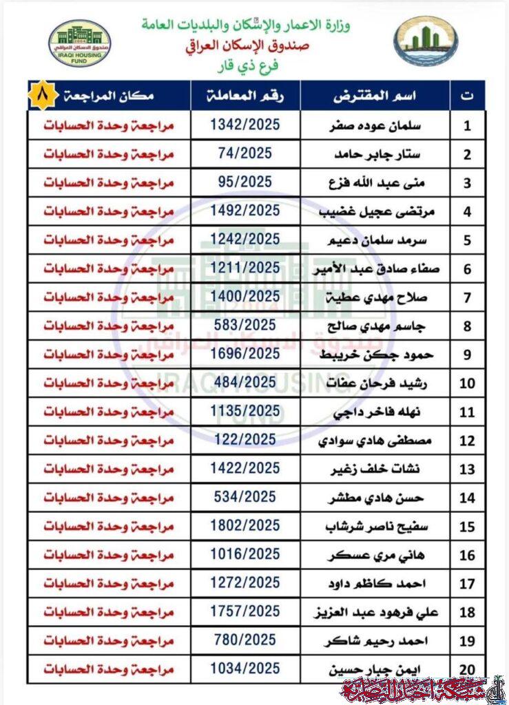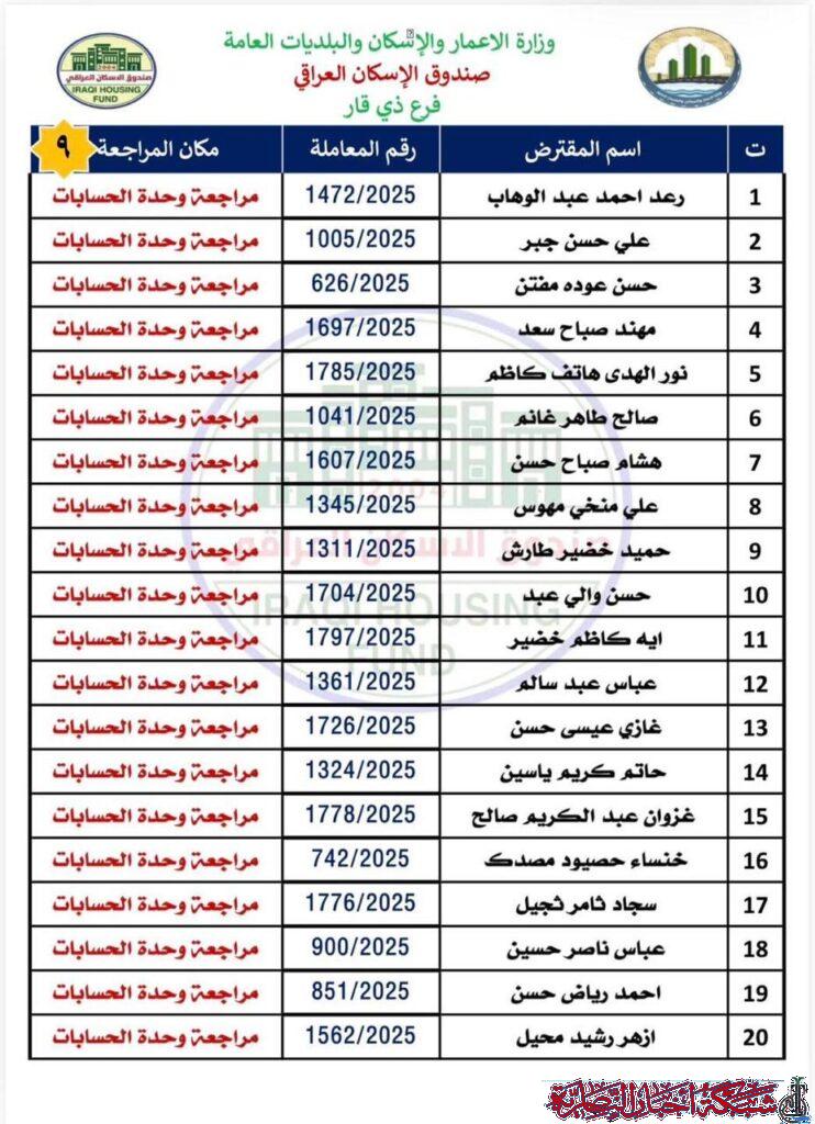 أعلن صندوق إسكان ذي قار عن وصول وجبة جديدة من صكوك قروض الإسكان للمستفيدين في المحافظة بواقع 327 صكا مصرفيا.