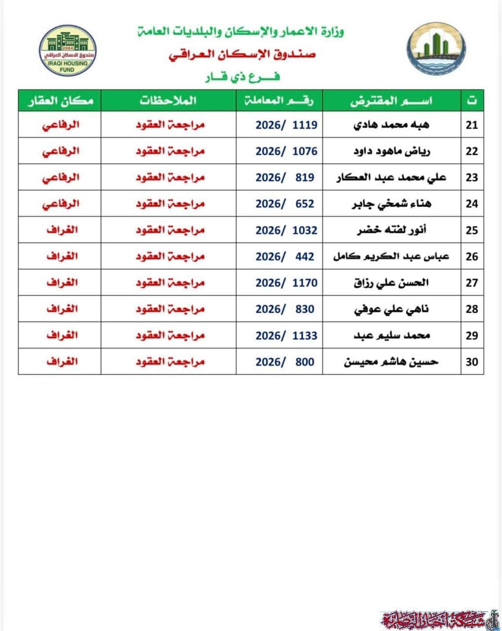 دعا صندوق إسكان ذي قار المقترضين المشمولين بلجنة الغراف والدواية والنصر إلى مراجعة الفرع لاستكمال إجراءات عقود القروض وحجز العقارات.