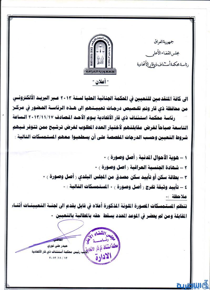 اعلان للمتقدمين للتعيين في المحكمة الجنائية العليا من محافظة ذي قار