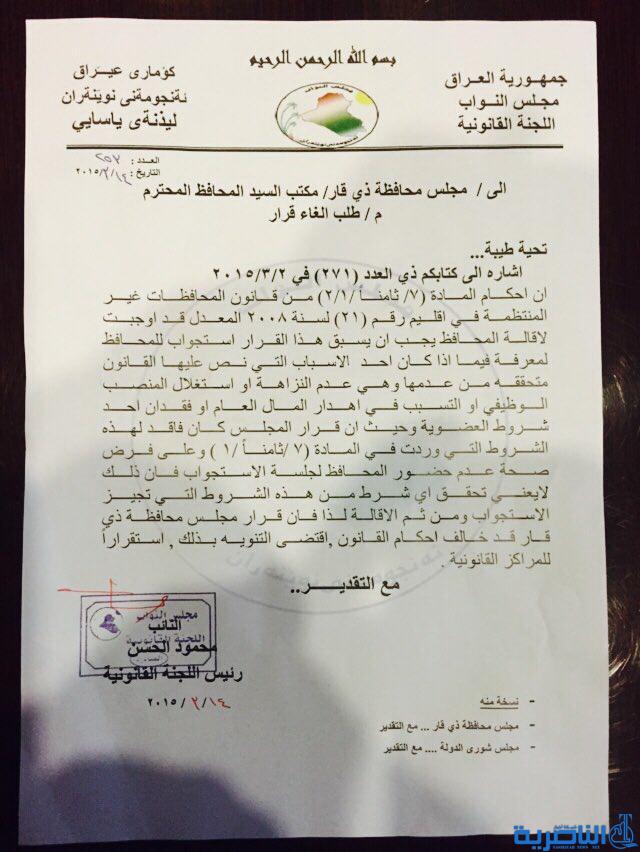 وثيقة :البرلمان العراقي يرفض اقالة محافظ ذي قار