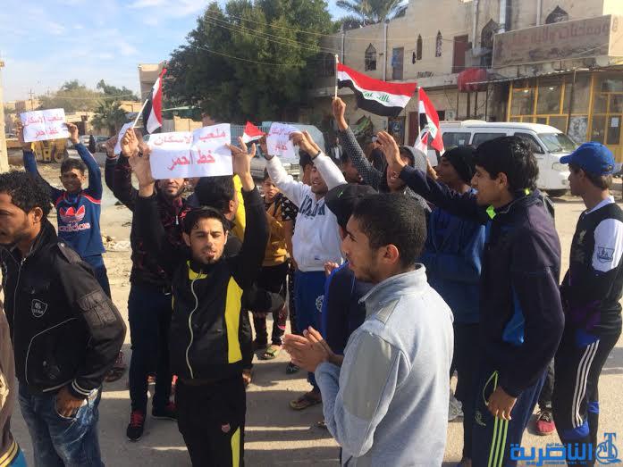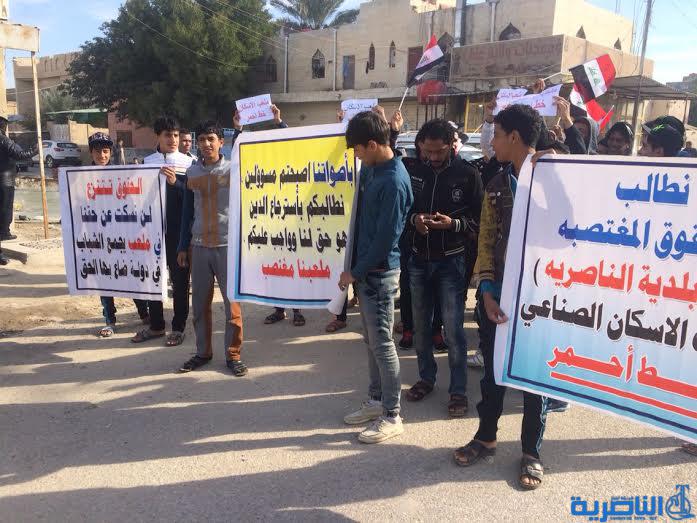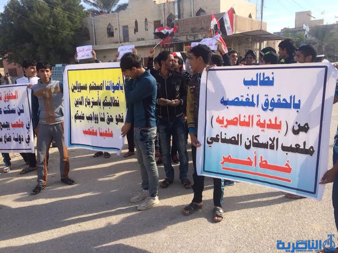 وتجمع المتظاهرون امام مبنى مجلس المحافظة وهم يرفعون لافتات كتب عليها ( ملعب الاسكان خط احمر ) و ( نطالب بالحقوق المغتصبة من بلدية الناصرية ، ملعب الاسكان الصناعي خط احمر) و ( لن نسكت عن حقنا في ملعب يجمع الشباب).