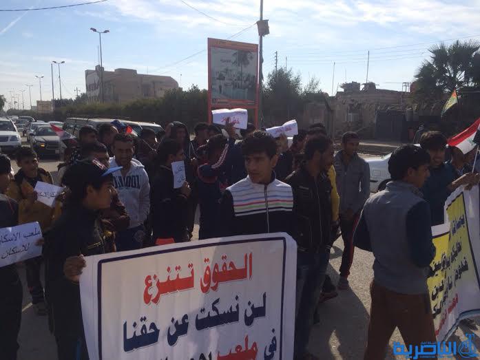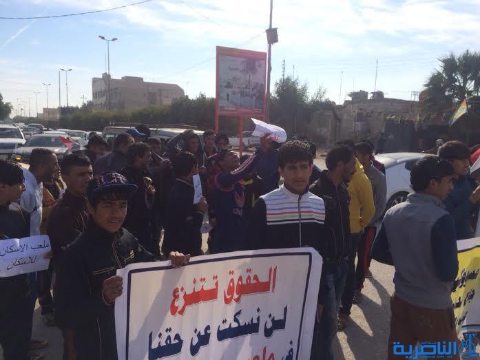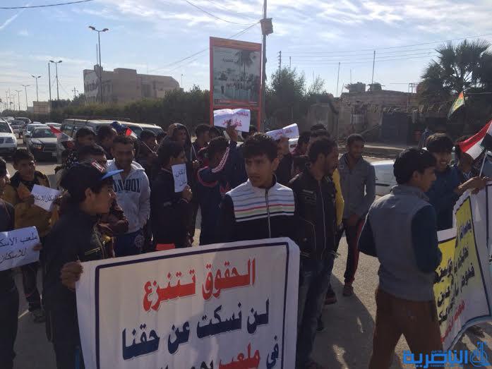 تظاهر العشرات من الرياضيين في مدينة الناصرية اليوم للمطالبة برفع يد مديرية البلدية عن احد الملاعب التي استحوذت عليها مؤخرا في حي الاسكان الصناعي ، والعمل على اعادة تاهيله وفتحه من جديد امام الفرق الشعبية في المنطقة .